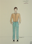 Seymour starts the show as a quiet boy who loves plants, and loves Audrey, but only really knows what to do about the plants… I started him on some really soft washed out blues and golds, and even a soft green in some of the plaids; as the story progresses, the color volume gets more intense, and as people start dying, it also gets bloodier. Beyond that, as the show goes on, though the elements of his clothing stay largely unchanged, somehow by the end he starts to look more like a man; A doomed man, but one who knows what it is to have his true love in his arms.